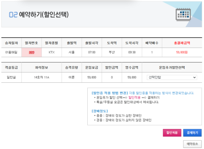 ▶ 원하시는 열차를 클릭하시면 승차권 환불에 관한 규정 팝업창이 뜨며, 기차표 내용 상세 내역을 확인하신 후 '결제하기' 버튼을 클릭해주시면 됩니다.
